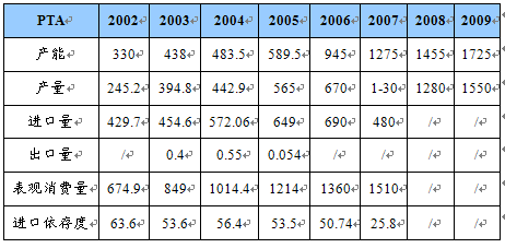 2002-2009年PTA生产消费情况及预计 单位:万吨