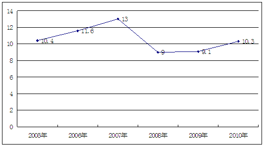 据中国汽车工业协会统计,我国全年累计生产汽车1826.47万辆,同比增长32.4%,销售汽车1806.19 万辆,同比增长32.4%,产销同比增长率较2009年分别下降了15.9和13.8个百分点。其中,乘用车产销1389.70万辆和1375.78万辆,同比增长33.8%和33.2%,产销同比增长率较2009年下降了20个百分点;商用车产销436.76万辆和430.41万辆,同比增长 28.2%和29.9%,销量同比增长较2009年提高1.5个百分点。
