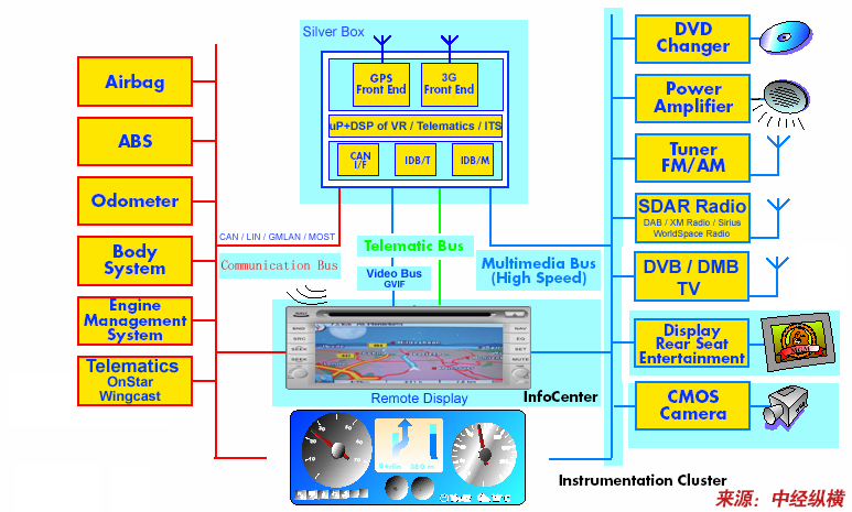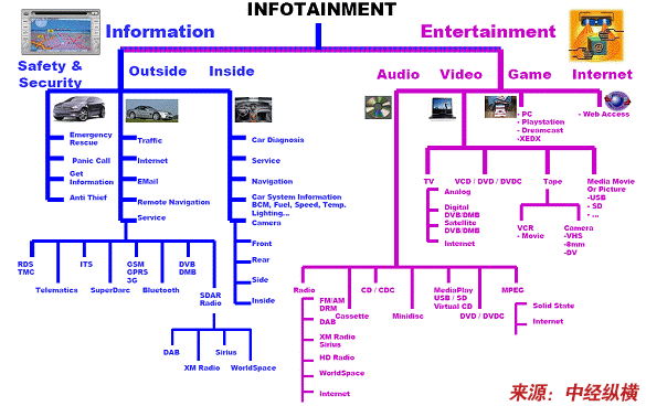国内外汽车音响厂家为了占领市场销售份额,不断推出各种具有先进性能和独特功能的产品吸引用户,比如:独特的防盗系统、光导纤维传送、全息激光头、CD换片机电子防震、缘边旋转入碟防刮机芯、超低中频数字调谐器、高质量的卫星调谐器、滑动开启前操作面板、 MASK新式秘密隐藏机构、智能操控转盘、动态超重低音、动态道路噪音控制、三维影音系统、话音识别系统、驾驶座声场模拟系统、声感录音等等。作为汽车多媒体的开发,但始终围绕着以下五个特征进行, 即:1)多功能; 2) 漂亮的产品外观设计; 3)高质量的音视频效果; 4)综合的信息系统与高度安全性能 和5)系统操作的容易性等。因此,我们可以将汽车多媒体称之为信息娱乐系统(INFOTAINMENT = Information + Entertainment),其理念可以综合为图1 和汽车多媒体系统架构图2.