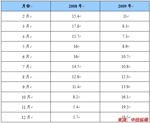 2008-2009年规模以上工业企业增加值变化表 单位:%