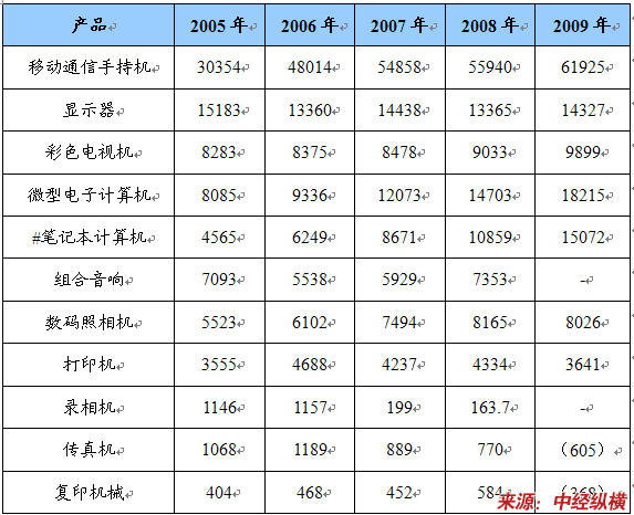 2009年,电子信息产品进出口7719亿美元,同比下降12.8%,这是本世纪以来首次负增长。其中出口4572亿美元,下降12.5%,占全国出口的38%;进口3147亿元,下降13.5%,占全国进口的31%。出口降幅逐步收窄,11、12月连续正增长。基础产品下滑明显,电子元件、材料分别下降23.6%、36.3%;整机产品降幅相对较小,通信、视听、计算机产品出口分别下降3.8%、12%、8.9%。