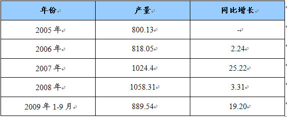 2005-2009年我国PET产量及增长 单位:万吨,%