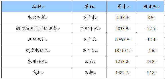 从铜市场消费相关的其他产品看,2009年,电力电缆、汽车及冷柜等产品产量呈现较高的增长势头;而发电机组、交流电动机及通信电缆等同比呈现下降。