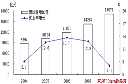 2004-2008年建筑业增加值及其增长速度