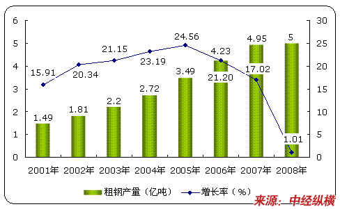 2001-2008年我国粗钢产量及其增长率变化