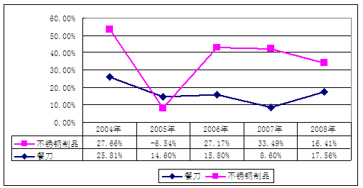 2003-2008年餐刀与不锈钢制品 行业 产值增长速度对比