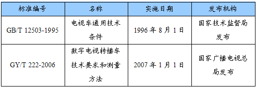 GB/T 12503-1995《电视车通用技术条件》规定了系列电视车的分类、技术要求、试验方法、检验规则、以及标志、运输、贮存。适用于符合GB3174规定的各类型复合电视信号系统及模拟分量电视信号系统的电视车。