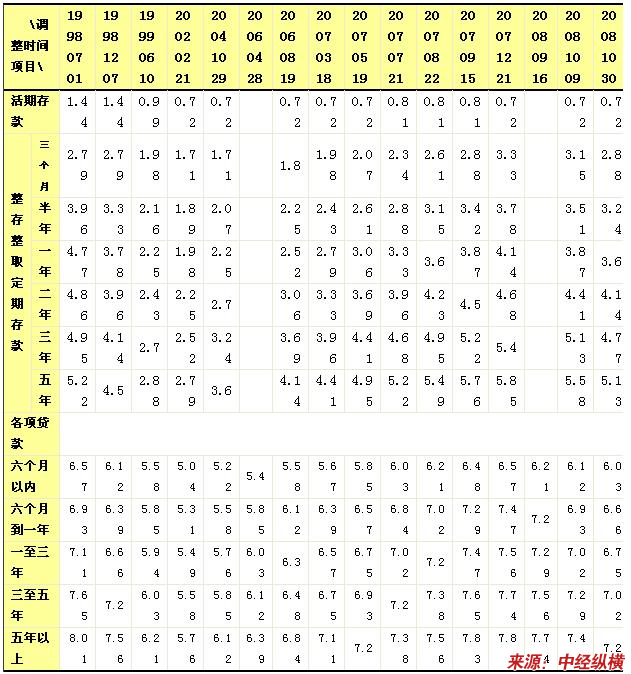 中国历年人民银行存贷款利率调整表(1998年-2008年)