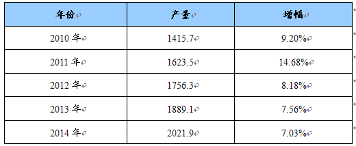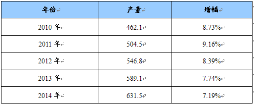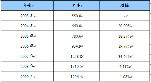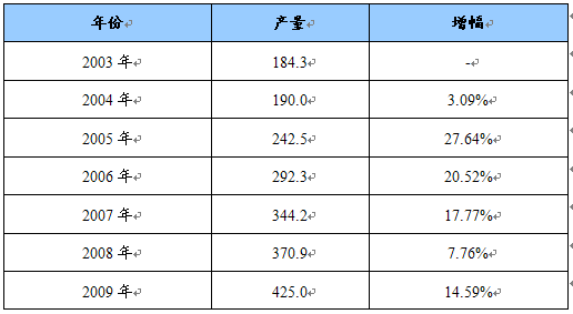 2003-2009年我国铜产量及增幅统计表 单位:万吨