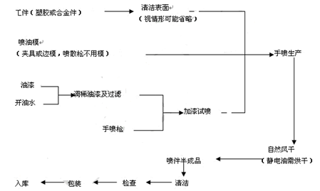 喷油生产工艺流程-手工喷油生产工艺流程依次包括塑胶件表面预处理及油漆稀释、喷油、晾干、清洁、检查、包装和入库等环节