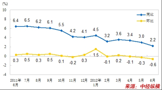 2012年上半年,居民消费价格同比上涨3.3%,涨幅比一季度回落0.5个百分点,比上年同期回落2.1个百分点。其中,城市上涨3.3%,农村上涨3.3%。
