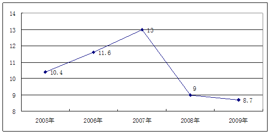 2009全年货物进出口总额22072亿美元,比上年下降13.9%。其中,货物出口12017亿美元,下降16.0%;货物进口10056亿美元,下降11.2%。进出口差额(出口减进口)1961亿美元,比上年减少1020亿美元。