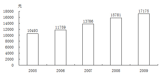 2009年全年城镇居民家庭人均总收入18858元。其中,城镇居民人均可支配收入17175元,比上年增长8.8%,扣除价格因素,实际增长9.8%。在城镇居民家庭人均总收入中,工资性收入增长9.6%,经营净收入增长5.2%,财产性收入增长11.6%,转移性收入增长14.9%。农村居民人均纯收入5153元,比上年增长8.2%,扣除价格因素,实际增长8.5%。其中,工资性收入增长11.2%,第一产业生产经营收入增长2.2%,二、三产业生产经营收入增长10.0%,财产性收入增长12.9%,转移性收入增长23.1%。全年城镇就业人员比上年净增910万人。年末农村外出务工劳动力1.49亿人,比一季度末增加170万人。