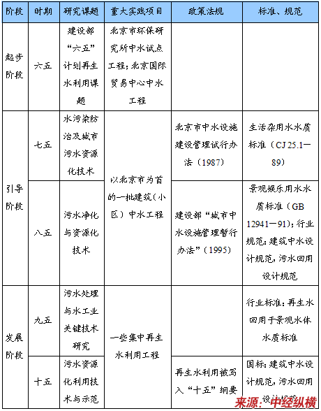 我国的再生水利用理论 研究 和实践经历了“六五”期间的起步阶段(1980~1985),“七五”到“九五”期间的技术储备和示范工程引导阶段(1986~2000)和目前的发展阶段。