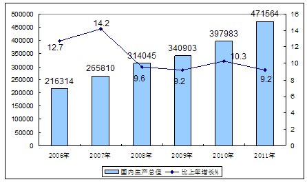 初步测算,2011全年国内生产总值471564亿元,按可比价格计算,比上年增长9.2%。分季度看,一季度同比增长9.7%,二季度增长9.5%,三季度增长9.1%,四季度增长8.9%。分产业看,第一产业增加值47712亿元,比上年增长4.5%;第二产业增加值220592亿元,增长10.6%;第三产业增加值203260亿元,增长8.9%。从环比看,四季度国内生产总值增长2.0%。