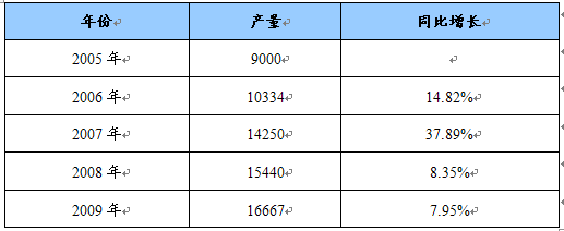 2005-2009年PTFE油封产量及同比增长统计表 单位:万件