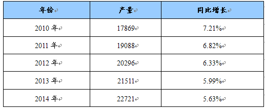 2010-2014年PTFE油封产量及同比增长预测表 单位:万件