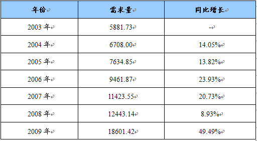 2003-2009年PTFE油封需求量及同比增长统计表 单位:万件