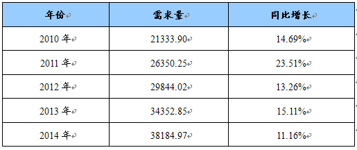 2010-2014年PTFE油封需求量及同比增长预测表 单位:万件