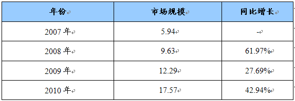 2007-2008年我国便携式车载卫星电视接收设备市场规模及未来两年预测表 单位:亿元