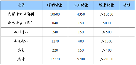 我国主要的稀土矿床(约占我国总储量的95%以上),基本上是1949年新中国成立后逐渐发现和经勘探查清其储量的。内蒙古白云鄂博、四川凉山冕宁牦牛坪、山东微山、南方七省区等地是我国稀土资源集中分布区。全国稀土资源已探明储量、工业储量、远景储量如表。