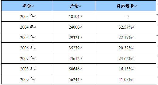 2003-2009年我国ECU检测仪产量及同比增长统计表 单位:台