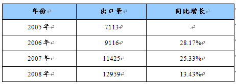 2005-2008年我国ECU检测仪出口量及同比增长统计表 单位:台