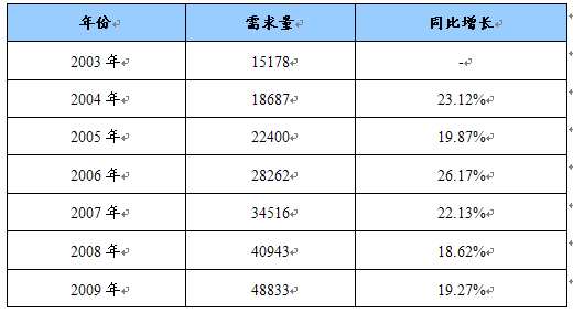 2003-2009年我国ECU检测仪需求量及同比增长统计表 单位:台