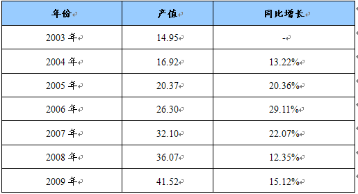 2003-2009年我国安防线缆产值统计表 单位:亿元