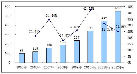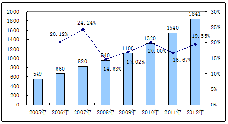 2005-2012年我国SMD LED支架市场需求量统计及预测图 单位:亿只