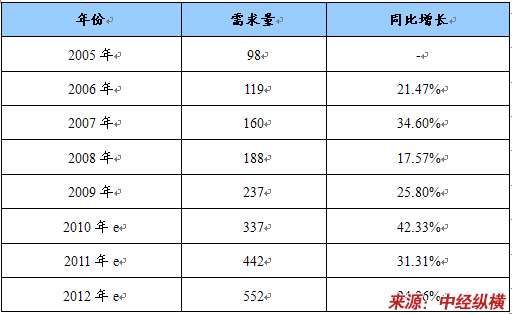 2005-2012年我国SMD LED支架市场需求量统计及预测表 单位:亿只