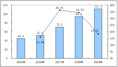 2006年封装产量达到660亿个,增长速度达到20.12%,产值达到148亿元。2007年产量达到820亿个,增长速度达到24.24%,产值168亿元,2008年我国LED封装产值达到185亿元,较2007年的168亿元增长10%;产量则由2007年的820亿只增加15%,达到940亿只,其中高亮LED产值达到140亿元,占LED总销售额的76%。经历了多年的发展以后,中国LED封装产业已经进入了平稳发展阶段。未来随着经济的复苏及2010年世博会的召开,LED下游应用市场需求的增加,预计2009-2012年中国LED封装产量年均复合增长率将达到18.3%。