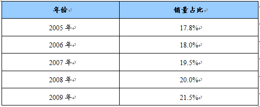 伴随着SMD LED产业在国内的迅速发展,市场上对SMD LED支架的消费增长快速上升,其产品销量占比LED支架已由2005年的17.8%上升到了2009年的21.5%。