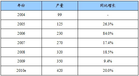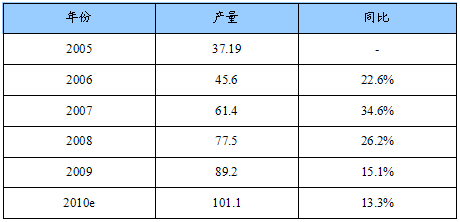 2005-2010年中国丙烯酸及酯单体产量统计表