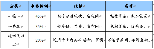 从各子类应用场所来看:一拖二、一拖三分别适用于一室一厅、两室一厅住房结构,而这两种住房结构是我国住房的主要结构,一拖四及以上适用于小型办公场所,虽然节能环保,但应用有限,因此一拖二及一拖三空调在家用方面市场前景巨大,而一拖四及以上市场在商用方面市场潜力巨大。