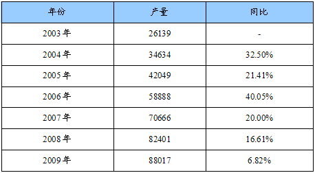 2009年全国铁矿石产量达88017.14万吨,同比增长6.82%,增幅与上年相比下降10个百分点。