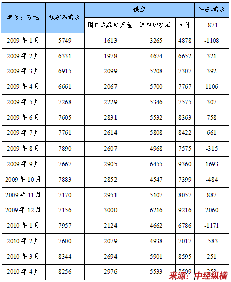 国内铁矿砂供给能力有限,缺口部分依赖进口弥补。2009年上半年,由于现货矿价大幅下跌,国内矿山一度大幅减产,中小型矿山停产面积最高几乎达70%,截至10月份,国内矿山的开工率依然偏低。近期,受气候因素影响,矿山开采及矿选厂生产基本进入停滞状态,国内可供资源量有限,港口库存量持续减少。此外,基于对后期市场的乐观预期,多数矿选企业囤货待涨心态浓重,出货积极性不高,出现提高报价甚至停售。国内铁矿砂供应不足,难以满足旺盛的需求,由此产生的供需缺口只能依赖进口弥补。