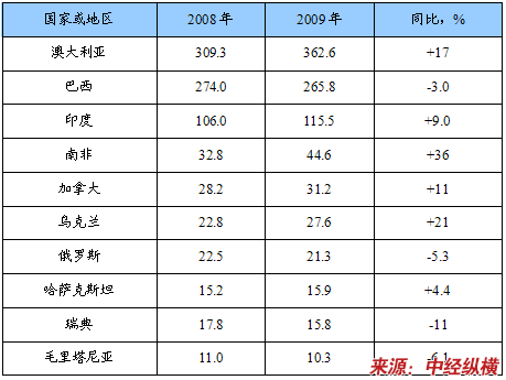 2009年,除澳大利亚和南非外,世界主要铁矿石生产国的产量都有所下降,其中中国在2010年因关停部分矿山还将减产。尽管产量下降,但全球铁矿石贸易在2009年依然创出新高,达9.55亿吨,比2008年增长了7.4%,其主要原因是中国进口的扩大。澳大利亚是最大出口国,出口量占其总产量的92%,增长了17%。