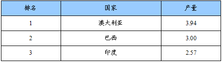 2009年巴西铁矿石产量达3亿吨,仅次于澳大利亚(3.94亿吨)。印度排名第三,产量为2.57亿吨,