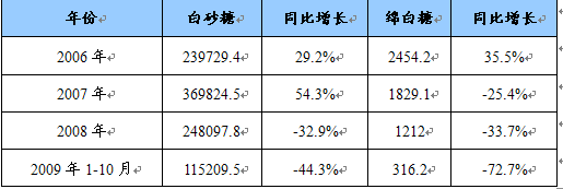 09/10年度我国白糖产量预计为1200万吨,较08/09年度下降了3.5%,近乎创下4年来新低。下降的原因主要来自甜菜糖的部分,预计09/10年度甜菜糖产量为60万吨,较08/09年度的90万吨下降了50%。