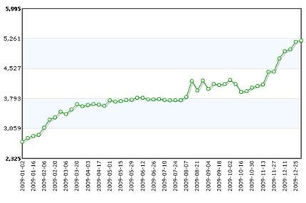 2009年白糖期价走势基本上按季度被鲜明地划分为四个阶段。其中,第一季度期价在广西食糖大幅减产的朦胧预期中振荡上行,2008年的冻灾“后遗症”成为熊市转牛的导火索。进入第二季度后,由于产量已经明朗加之销售淡季的到来,郑糖期价陷入长时间的振荡整理之中,但重心依然小幅上移。第三季度由于外盘原糖走出突破式单边暴涨行情,带动了国内白糖期价的第二波涨势。而到了第四季度,期货价格触及5000元关口引发了糖厂套保资金和投机盘的获利回吐,因此随后期价又陷入为期不短的振荡整理之中。稍事休整之后,由于春节备糖高峰期恰逢销区库存薄弱,跨年度上涨行情再度如约而至。总体而言,整个2009年糖市可谓是红红火火。