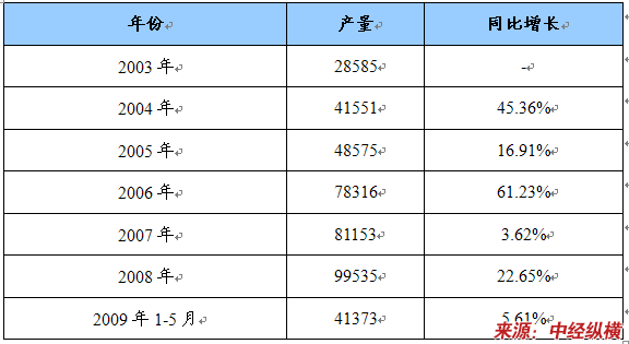 2003-2009年我国PVC夹网材料产量及其增长统计 单位:万平米