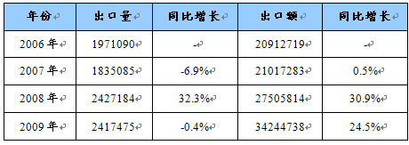 2006-2009我国煤气表(HS:90281010)出口量值统计表 单位:个、美元