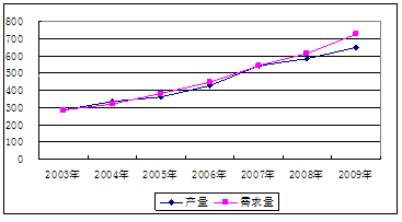 2003-2009年我国IC卡膜式家用燃气表供需平衡对比图 单位:万台