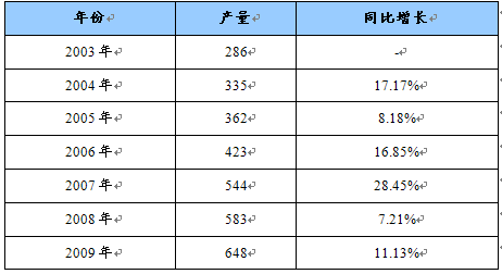 2003-2009年我国IC卡膜式家用燃气表产量及同比增长统计表 单位:万台