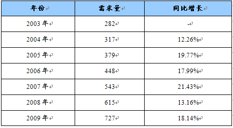 2003-2009年我国IC卡膜式家用燃气表需求量及同比增长统计表 单位:万台