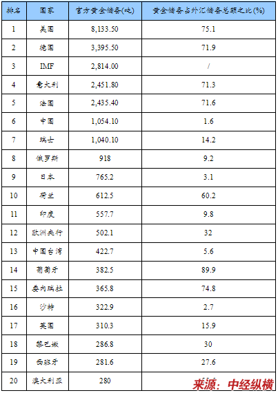 官方黄金储备前20位排行表