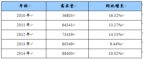 2010-2014年我国ECU检测仪需求量及同比增长预测表 单位:台