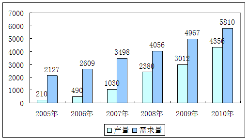 2005-2010年中国3-巯基丙酸产量、需求量对比图
