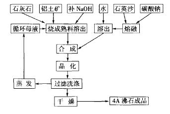 工艺流程概述如下:以铝矾土和石灰石为原料,在一定温度下经焙烧活化后,与水玻璃反应,生产硅铝酸钠,在经结晶、过滤、干燥生产4A沸石产品。